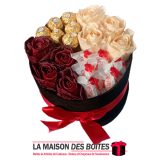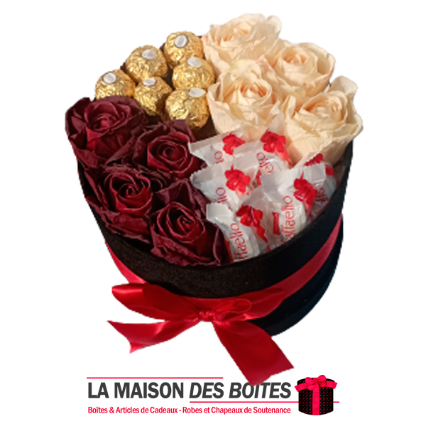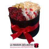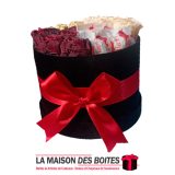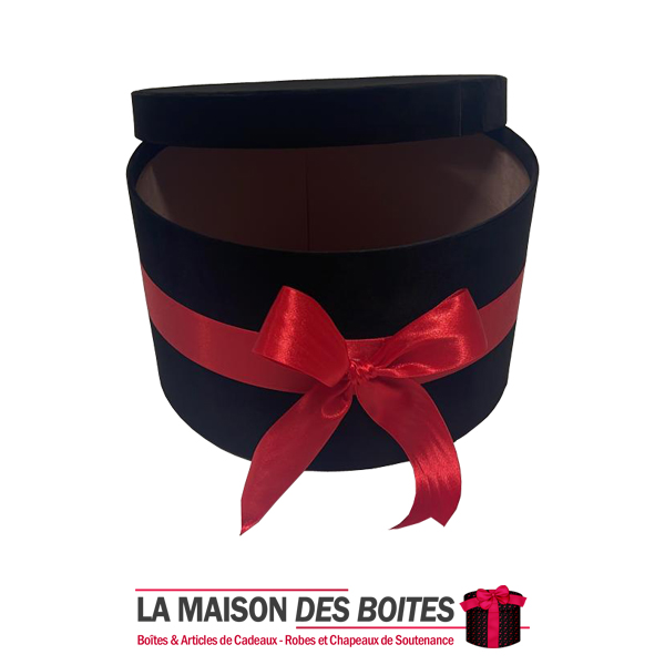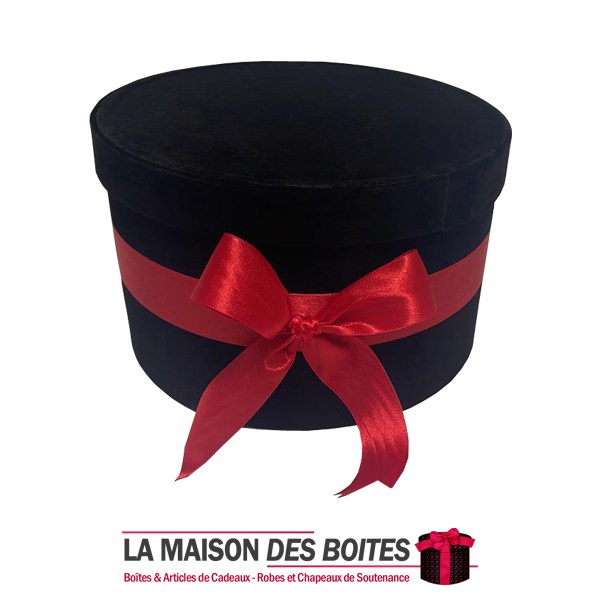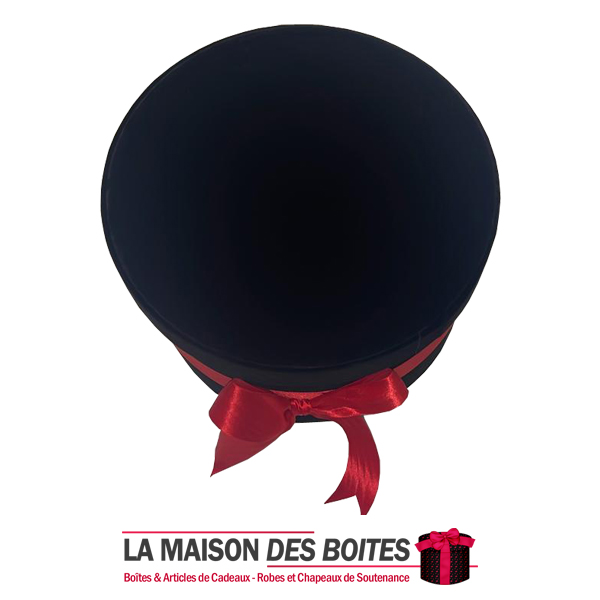 Boîte Cadeau sous Forme Ronde en Velours de couleur Noir, avec Ruban Satiné Rouge , Une très belle façon d’offrir des fleurs pour l’occasion de fiançaille, declaration d’amour , saint-valentine …….