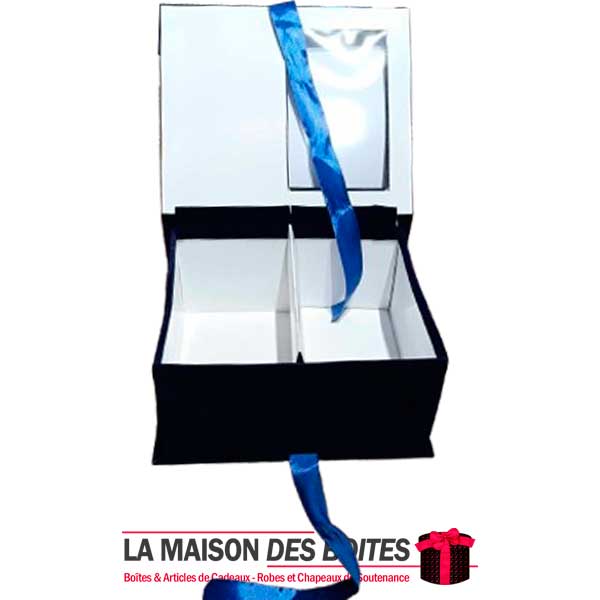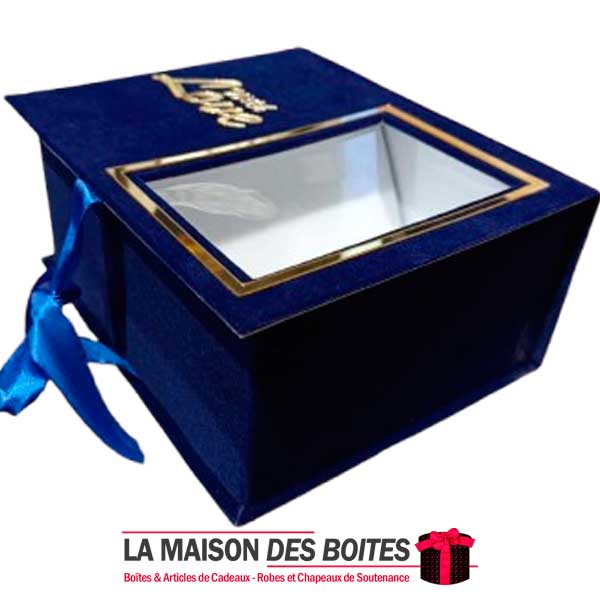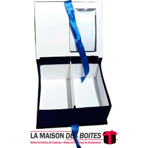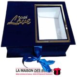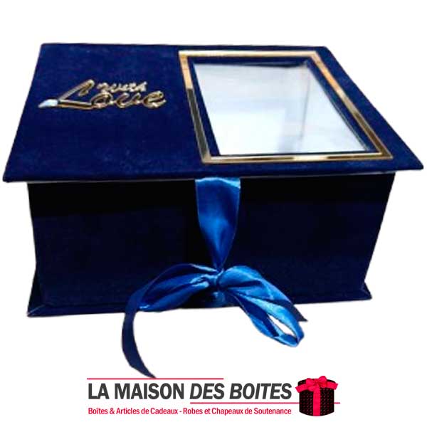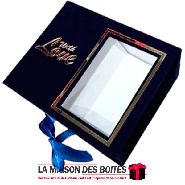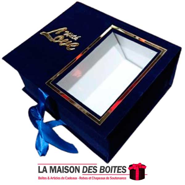 Une très belle façon d’offrir pour la Saint-Valentin ou bien d’autres occasions, boîte en carton très épais de qualité Couvert en Velours designé avec Plexi Doré « With Love » rectangulaire avec séparation en milieu avec Fenêtre transparent , orné d’un Ruban satiné de couleur Bleu