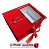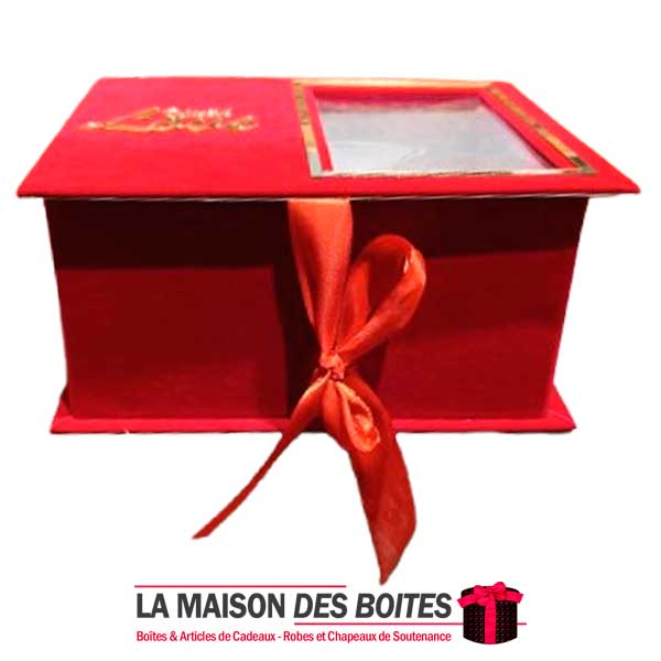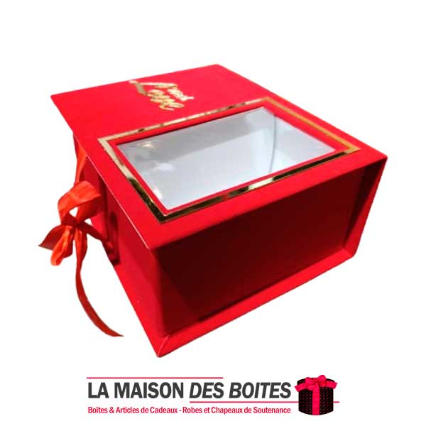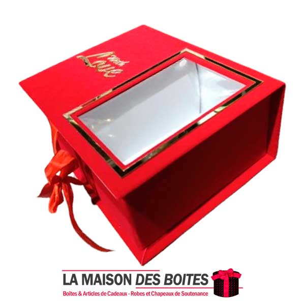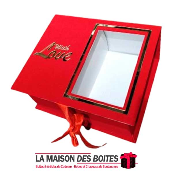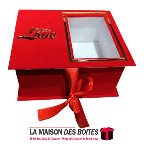 Une très belle façon d’offrir pour la Saint-Valentin ou bien d’autres occasions, boîte en carton très épais de qualité Couvert en Velours designé avec Plexi Doré « With Love » rectangulaire avec séparation en milieu avec Fenêtre transparent , orné d’un Ruban satiné de couleur Rouge