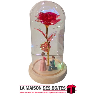 Rose éternelle de la galaxie enchantée 24K en feuille d’or, fleur avec guirlande lumineuse féerique en dôme sous socle en bois , avec deux couples amoureux en train de demander mariage ❤️❤️